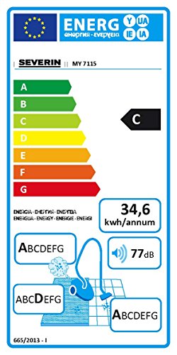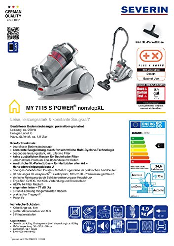 Severin S’powers nonstopXL, 950 W, C, Cilindro, Senza sacchetto, Rosso, Argento, HEPA . Severin S’powers nonstopXL. Massima potenza in entrata: 950 W, Classe efficienza energetica: C. Modello: Cilindro, Tipo di contenitore della polvere: Senza sacchetto, Colore del prodotto: Rosso, Argento. Sistema di filtraggio dell’aspirapolvere: HEPA, Uso appropriato: Casa, Superficie di pulizia: Tappeto, Hard floor. Lunghezza cavo: 6 m. Peso: 4,900 kg, Larghezza imballo: 56 cm, Profondità imballo: 32,500 cm
