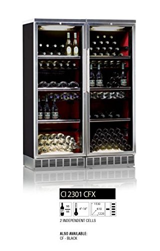 Rivestimento in acciaio inox, doppia porta a battente. Le due celle indipendenti permettono di mantenere alla giusta temperatura sia i rossi che i bianchi. Entrambe con temperatura dai +4 ai +18 gradi, per 98 + 98 bottiglie da 750 ml, disponibili anche a multi temperatura. Due luci, 6 ripiani stoccaggio, 6 ripiani intermedi e 2 ripiani scorrevoli.