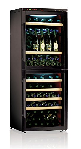 Due porte in doppio vetro per due celle completamente indipendenti. Regolazione autonoma di due temperature dai +4 ai +18 gradi. Cella superiore con capienza di 58 bottiglie da 750 ml, cella inferiore con capienza di 56 bottiglie da 750 ml. Due luci interne, 3 ripiani stoccaggio, 1 ripiano scorrevole, 3 ripiani intermedi per una capienza complessiva di 114 bottiglie da 750 ml. Disponibile nel colore nero