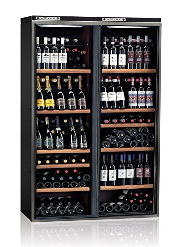 Le porte scorrevoli in vetro riducono gli ingombri , le due celle indipendenti permettono di mantenere alla giusta temperatura sia i rossi che i bianchi. Entrambe con temperatura dai +6 ai +18 gradi, per 138 + 138 bottiglie da 750 ml, disponibili anche a multi temperatura. Due luci, serratura optional, 8 ripiani stoccaggio e 10 ripiani intermedi per una capienza complessiva di 276 bottiglie da 750 ml. Disponibile nei colori nero con il profilo della porta inox.
