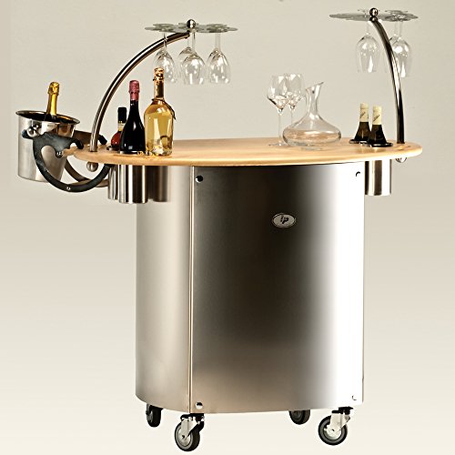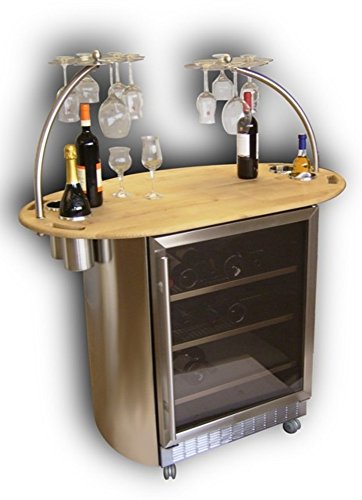 Un’isola di lavoro in acciaio inox con cantina climatizzata a una o a due temperature Quattro ruote pivottanti di cui due con freno, ampio piano di lavoro in legno (75 x 120 cm). 4 pratici vani estraibili per i cannotti portabottiglie in acciaio inox o ciotole porta frutta e snack, due pratici porta calici regolabili e cestello portaghiaccio in acciaio inox.