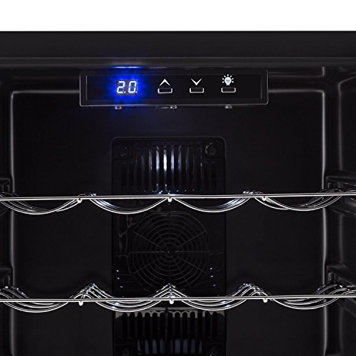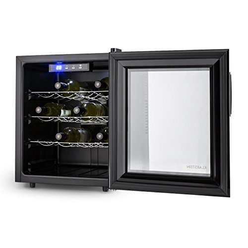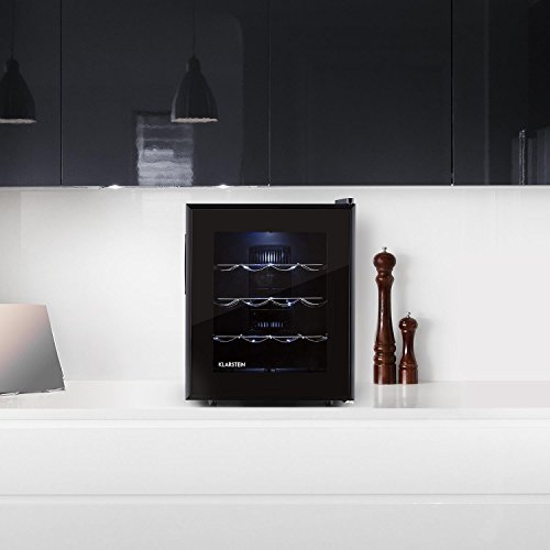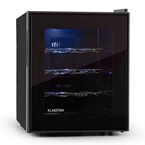 snella cantinetta frigo per vini con 48 litri di volume e spazio per 16 bottiglie tradizionali | porta in vetro con doppio isolamento e piccolo vano per una comoda presa sul lato | tre ripiani in metallo estraibili e discreta illuminazione LED interna