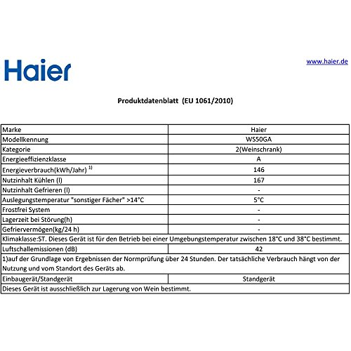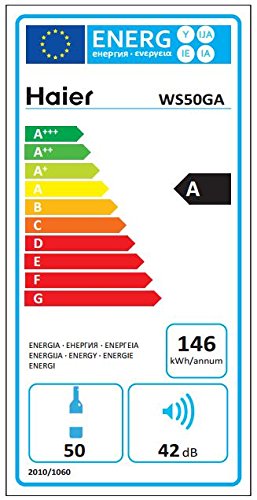 Caratteristiche: Codice: WS50GA Classe Energetica: A Consumo Energetico Annuo: 146kW/h Numero di Ripiani: 10 in Legno Capacita’: 50 Bottiglie Sistema d’Illuminazione: A LED Compressore a Basse Vibrazioni Filtro ai Carboni Attivi Porta a Vetro con Filtro Anti-UV Livello di Rumorosita’: 42dB(A) Piedini Regolabili Anteriori/Posteriori Tensione/Frequenza: 220V-240V / 50Hz Dimensioni (AxLxP): 1270x500x540mm
