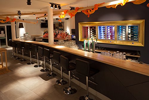 Espositore da incasso refrigerato con 3 cantine indipendenti, con cornice sagomata oro, appoggiata sopra al cavalletto crea un effetto quadro, con perfetta visibilità delle bottiglie ed effettiva comodità di servizio. Temperatura regolabile da + 6 a + 18 gradi, capienza 144 bottiglie posizionate orizzontali con colli esterni, luci led
