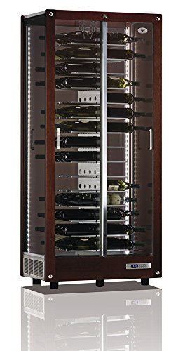 Linea essenziale per l’espositore refrigerato con 3 lati in vetro, programma di refrigerazione multifunzionale, posizionamento bottiglie orizzontali con colli esterni, colore ciliegio, luce led, capienza 120 bottiglie