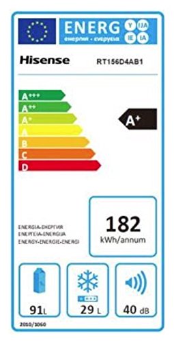 Hisense RT-156D4AG1 Frigo 120lt Classe A+ 116hx48cm – Hisense RT-156D4AG1. Installazione: Libera installazione, Colore del prodotto: Grigio, Cerniera porta: Destra. Capacità netta totale: 120 L, Emissione acustica: 40 dB. Capacità netta frigorifero: 91 L, Tipo di lampada: LED. Posizione del congelatore: Posto in alto, Capacità netta congelatore: 29 L, Capacità di congelamento: 2 kg/24h. Classe efficienza energetica: A+, Consumo energetico annuo: 182 kWh, Alimentazione: Elettrico