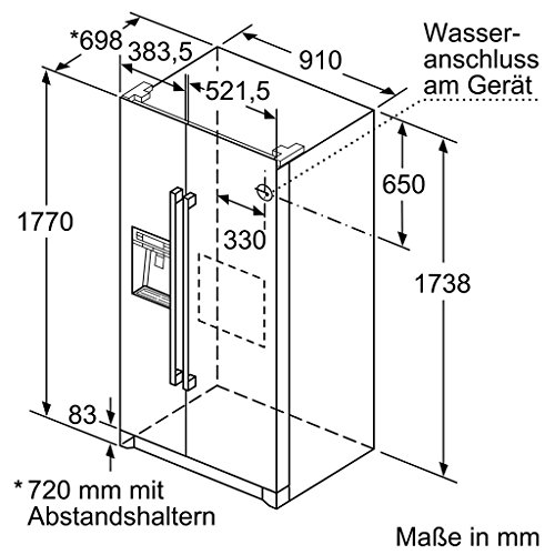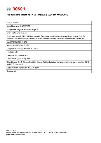 Bosch Frigorifero Side by Side KAD90VI30 finitura inox da 91cm Cod. KAD90VI30 Caratteristiche generali: NoFrost Multi Airflow-System Capacita’ netta totale 533 litri Display LED digitale integrato nella porta per la regolazione separata della temperatura dei due vani Funzione raffreddamento Super Tasto Super per congelamento intensivo con spegnimento automatico Allarme porta aperta Allarme ottico e acustico per aumento della temperatura Dispenser illuminato per acqua fredda, cubetti ghiaccio e ghiaccio tritato Filtro acqua Interni con inserti metallici Illuminazione interna a LED Vano frigorifero: 4 ripiani in vetro infrangibile di cui 1 regolabili in altezza 3 balconcini di ampie dimensioni Speciale scomparto MultiBox sulla controporta 2 MultiBox su rotelle – cassetto trasparente con fondo ondulato, ideale per frutta e verdura Vano congelatore****: 4 ripiani di cui 2 regolabili in altezza 2 cassetti trasparenti 4 balconcini Caratteristiche tecniche: Apparecchio su 4 rotelle, piedini regolabili Dimensioni (LxPxA): 91 x 72 x 177 cm