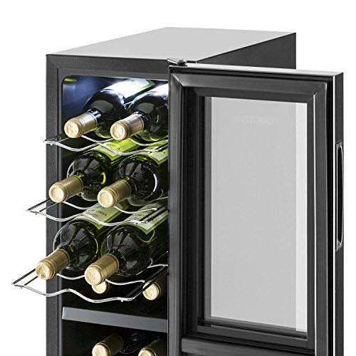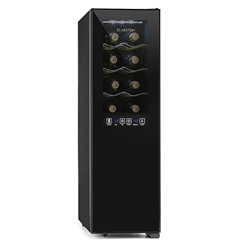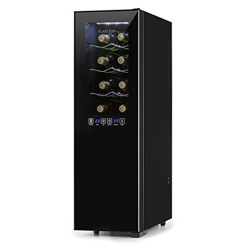 cantinetta frigo per vini eco-sostenibile con 45 litri in volume per 16 bottiglie | sei ripiani in metallo estraibili e illuminazione interna LED attivabile | frontale in vetro con doppio isolamento, schermo LCD con indicazione temperatura e sensibile pannello di controllo touch