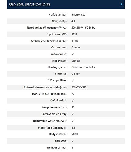 TipologiaEspresso machineTipologia CaffettieraSemi-automaticaTipo di CaffèCaffè macinatoMassima Pressione Operativa15 barCapacità in Tazze2 tazzeTipi di BevandeCappuccino, EspressoTubo per il VaporeSìCapacità Tanica Acqua1,4 LNumero di Erogatori2Macinatore IntegratoNoTanica Acqua RimovibileSìVaschetta per Caffè PreparatoTazzaVassoio Anti-goccia RimovibileSìIndicatore di Livello dell’AcquaSìScalda TazzaSìSpiaSìDisplay IntegratoNoCarico di Collegamento1100 WTensione d’Ingresso AC220-240 VFrequenza d’Ingresso AC50/60 HzInstallazioneLibera installazioneMateriale AlloggiamentoAcciaio inossidabileTipo di ControlloPulsantiColoreCream, BiancoLarghezza29 cmProfondità26 cmAltezza31,5 cmPeso4,1 kg