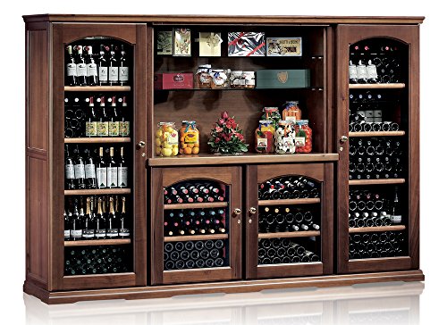 Rivestimento in legno massello finemente lavorato. Ha 4 celle indipendenti per una capienza complessiva di 376 bottiglie da 750 ml. Luci interne,serrature, 12 ripiani intermedi, 12 ripiani stoccaggio e temperatura dai +4 ai +18 gradi. Disponibile nei colori ciliegio, noce, rovere e wenghe., e a campione.