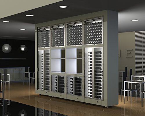 Otto cantine refrigerate per l’esposizione elegante e raffinata di bottiglie coricate con colli esterni, programma di refrigerazione multiplo, estremamente adattabile alle proprie esigenze combinate con due vani a giorno. Versione centrale con accesso da ambo i lati, cornice lineare bianca, luci led, capacità 592 bottiglie
