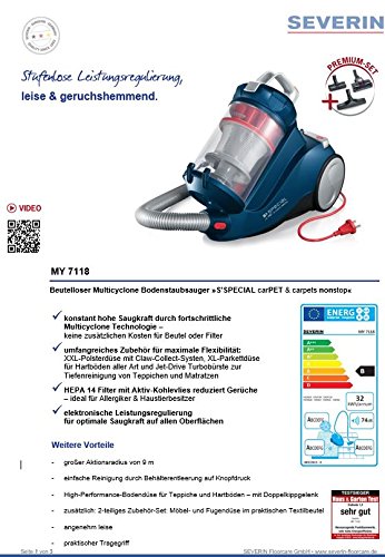 CARATTERISTICHE TECNICHE: – aspirapolvere senza sacchetto – aspirazione costante grazie all’avanzata tecnologia Multicyclone – nessun costo aggiuntivo per i sacchetti – spazzola per pavimenti universale con commutatore per superfici morbide o dure (modello Wessel RD296) – spazzola supplementare XL per parquet – adatta a tutti i pavimenti duri – categoria di efficacia pulente su superfici dure: A – accessorio per superfici morbide con sistema “Claw Collect” XXL per eliminare – facilmente tutti i peli, i capelli e polveri sottili – spazzola “Turbo Jet-drive” per la pulizia profonda di tappeti e materassi – set di 2 accessori: bocchetta per mobili e bocchetta per fessure con pratica custodia in stoffa – potenza di aspirazione regolabile – tubo telescopico XL easytouch da 90 cm, tubo flessibile di aspirazione XL Premium da 180 cm – facile pulizia grazie allo svuotamento del recipiente con la sola pressione di un pulsante – impugnatura Ergo Soft XL, con aggancio a scatto al tubo telescopico e protezione antipiega – filtro HEPA 14 a carboni attivi per neutralizzare gli odori – categoria di trattenimento della polvere: A – estremamente silenzioso – max 74 dB (A) – 3 ruote rivestite in gomma per non rovinare le superfici – pratica maniglia di trasporto – parcheggio del tubo sull’aspirapolvere sia in orizzontale che in verticale – indicatore di contenitore polvere pieno Dati tecnici: – lunghezza del cavo ca. 6 m – raggio d’azione di 9 m – 6 stadi di filtrazione